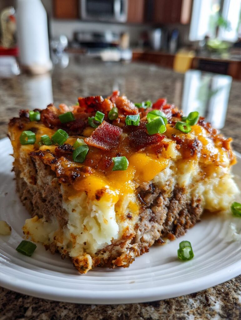 Cheesy Loaded Meatloaf Casserole is a hearty dish that combines meatloaf and mashed potatoes, topped with cheese and bacon.
