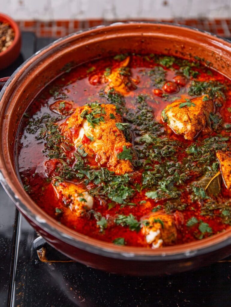 A flavorful and aromatic dish featuring firm white fish cooked in a rich, spicy sauce with a blend of Moroccan spices.