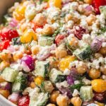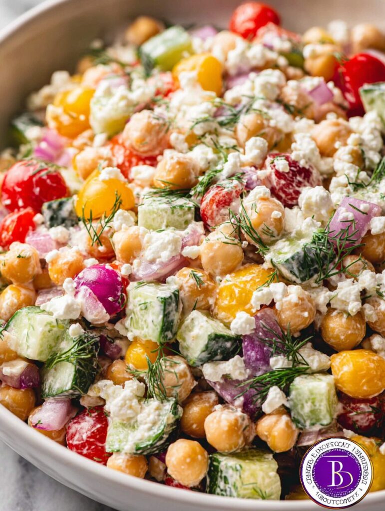 A delicious and creamy Mediterranean chickpea salad that combines fresh vegetables, chickpeas, and a tangy dressing, perfect for a healthy meal.