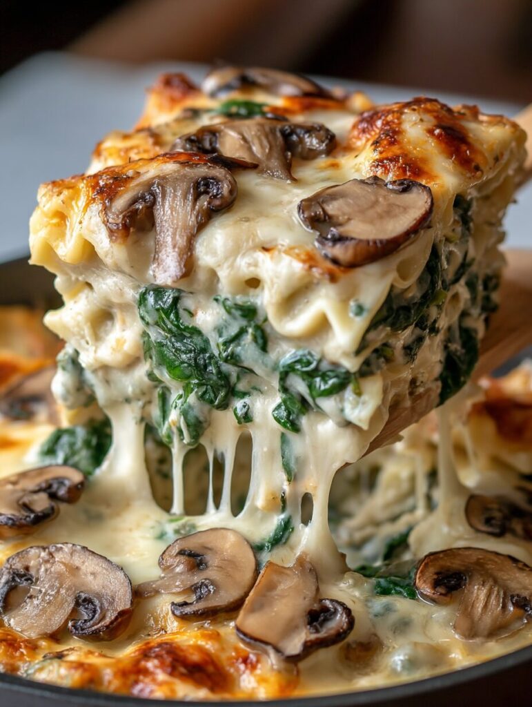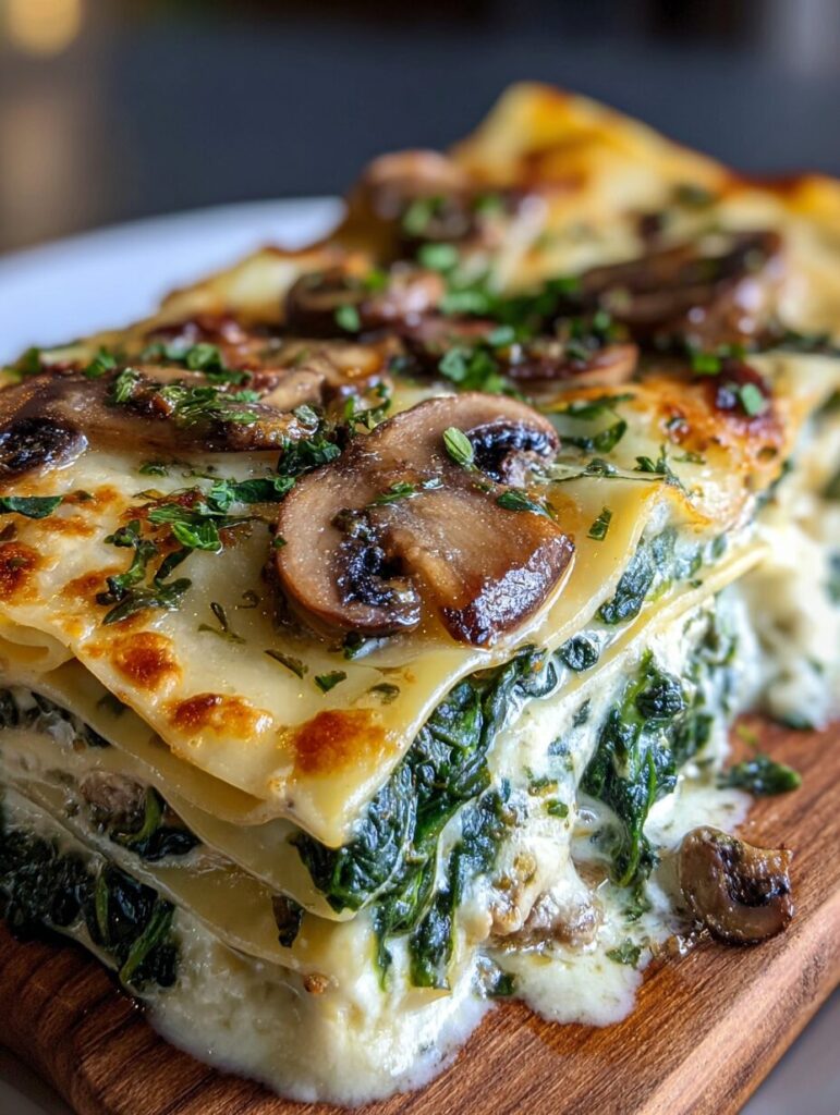 A comforting and creamy lasagna filled with spinach and mushrooms, perfect for a vegetarian meal.