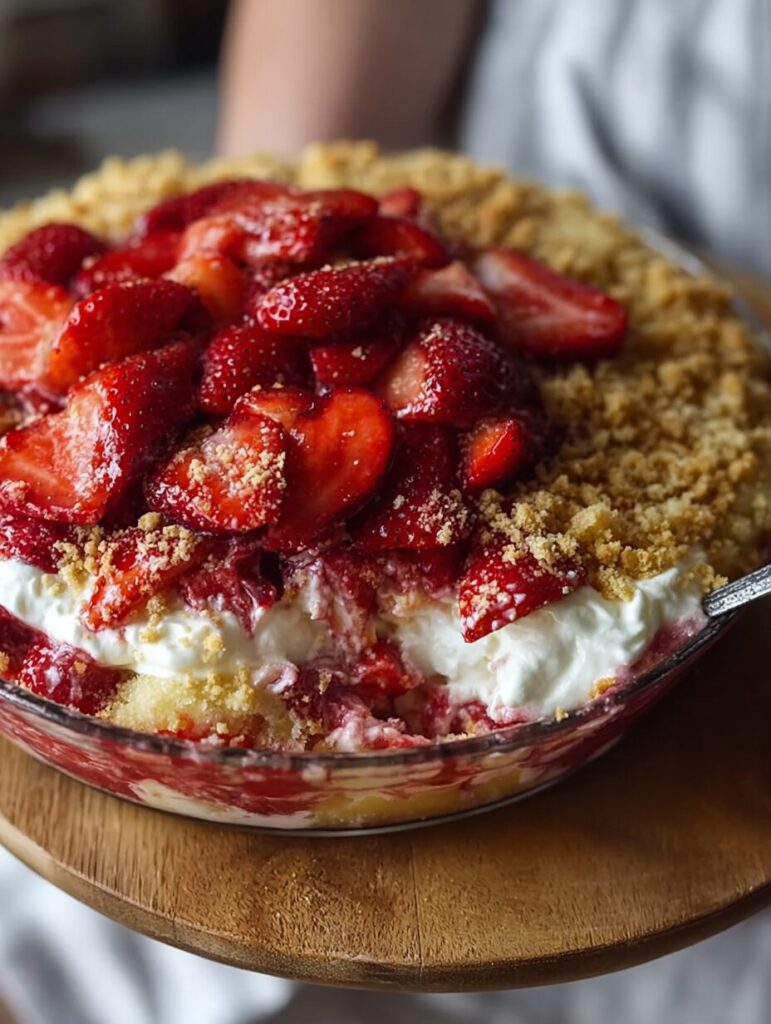 A delightful and easy-to-make strawberry cheesecake dump cake that combines the flavors of cream cheese and fresh strawberries, topped with a golden cake layer.