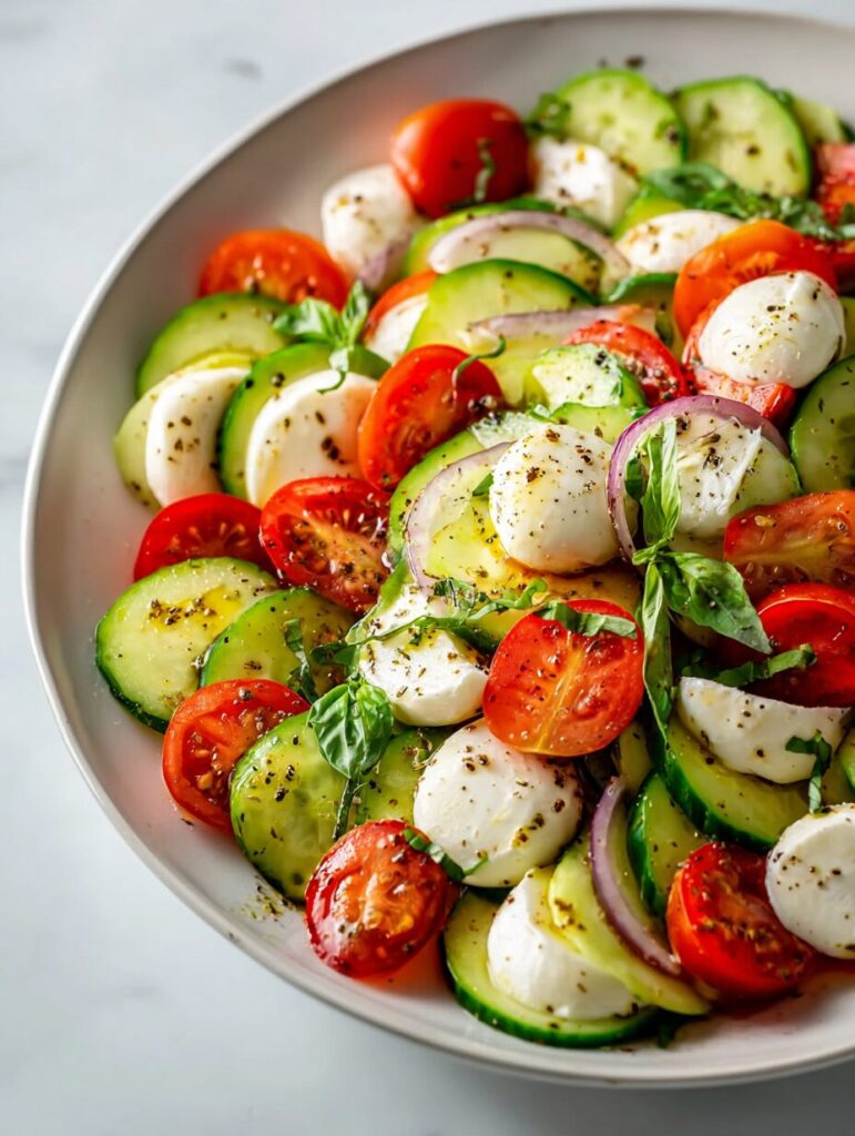 A refreshing and vibrant Fresh Cucumber Caprese Salad that combines the crispness of cucumbers, the sweetness of cherry tomatoes, and the creaminess of mozzarella, all enhanced by a flavorful marinade.