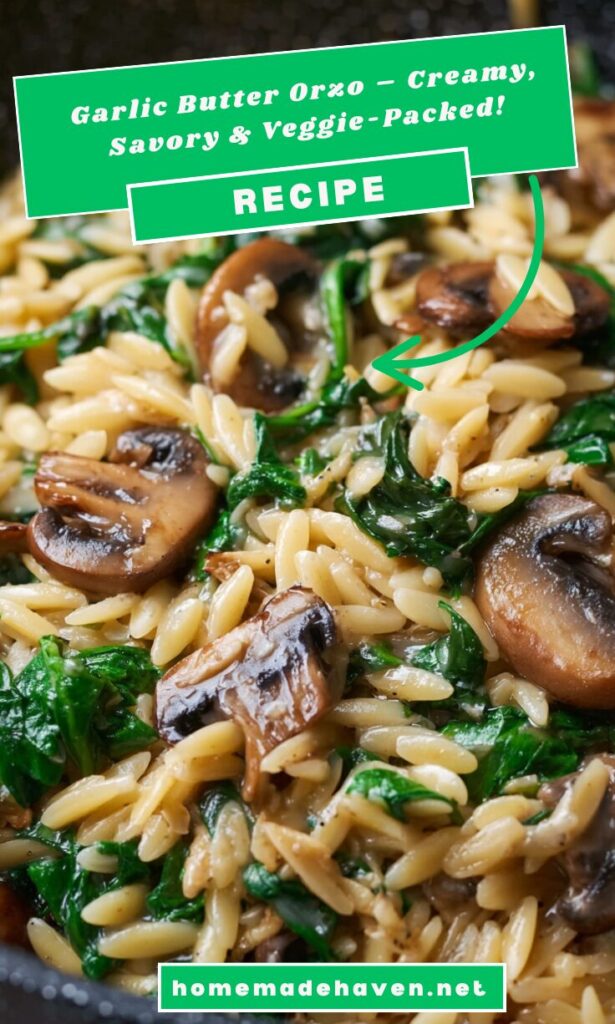 A delicious and easy recipe for Garlic Butter Orzo with Mushrooms and Spinach, perfect for a quick weeknight dinner.