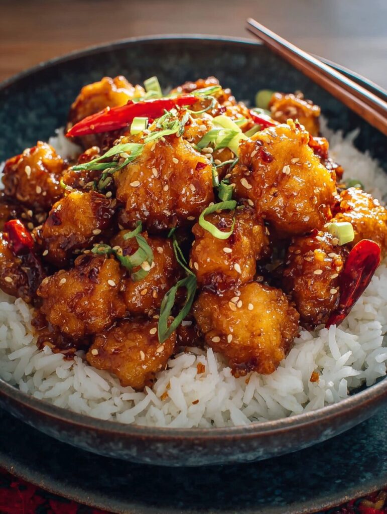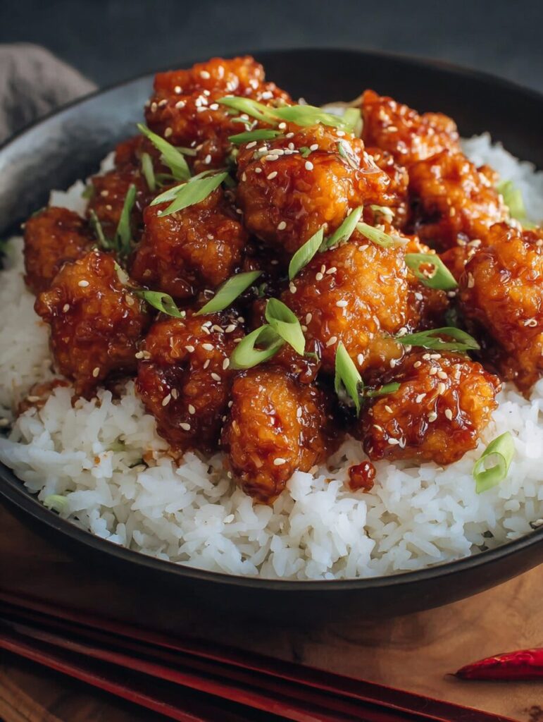 General Tso’s Chicken is a popular Chinese takeout dish featuring crispy fried chicken pieces coated in a sweet and spicy sauce.