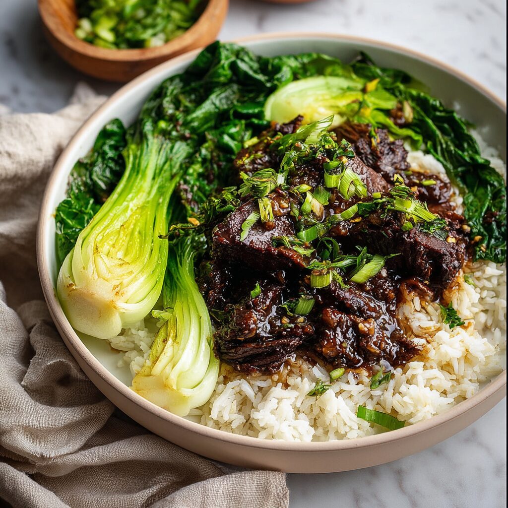 Serving Ginger Soy Braised Beef over fluffy rice is traditional, but consider pairing it with buttery mashed potatoes or a savory quinoa pilaf for added texture and flavor. Complement the dish with steamed bok choy or sautéed green beans, which will introduce a fresh crunch and vibrant color, making the meal visually appealing and satisfying.