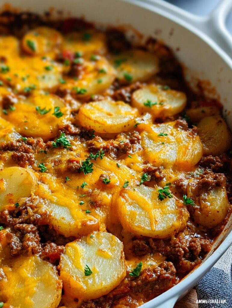 Make sure to cook the ground beef thoroughly and slice the potatoes evenly. Also, don’t skip the foil cover during the first hour of baking to keep everything moist!