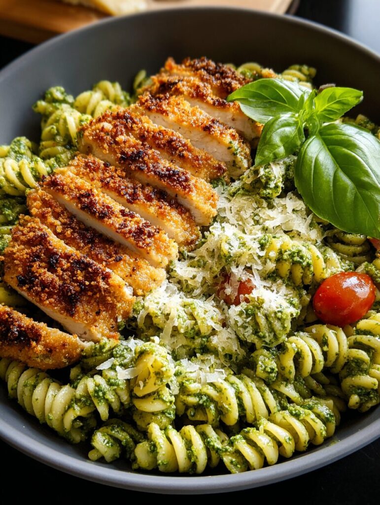 Imagine twirling a fork through silky strands of pesto-coated pasta, topped with juicy slices of crispy parmesan chicken that add a savory crunch to every bite. Whether you’re hosting a dinner party or feeding picky eaters at home, this dish hits every note—easy, cheesy, crispy, and totally satisfying.