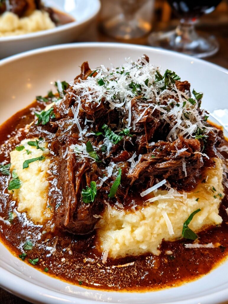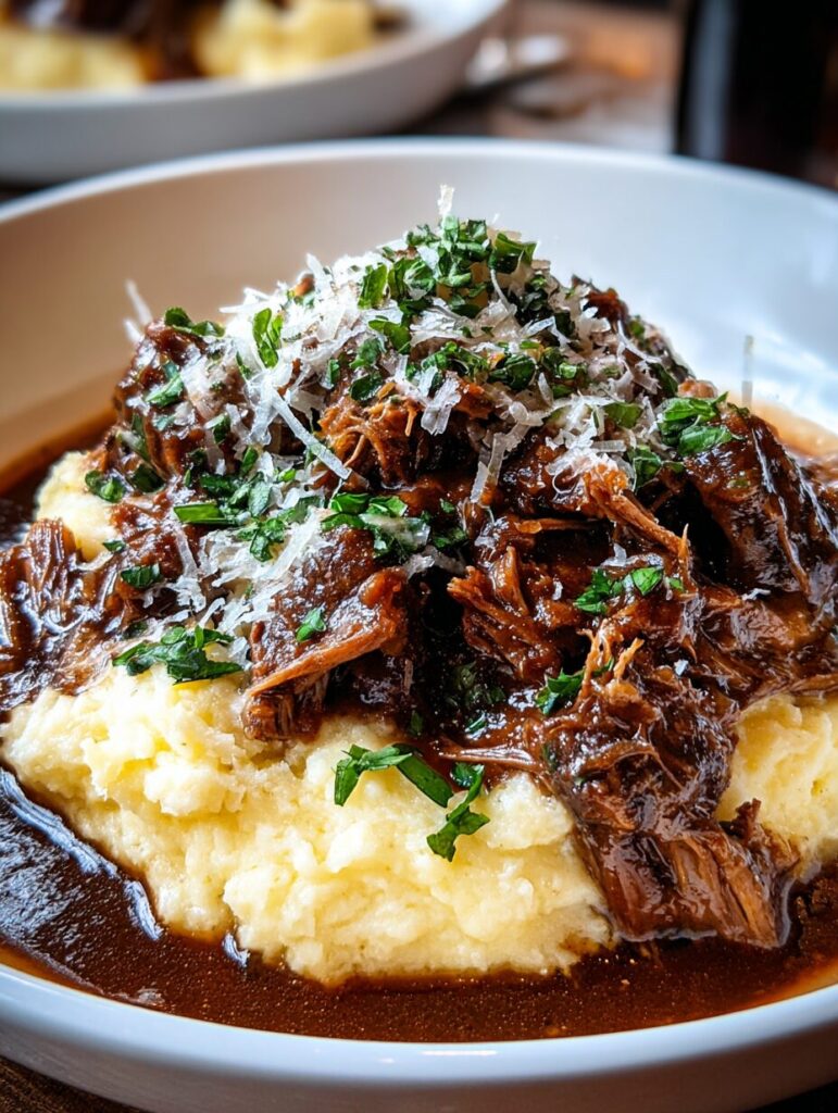 A delicious and hearty dish featuring tender braised short ribs served over creamy Parmesan mashed potatoes.