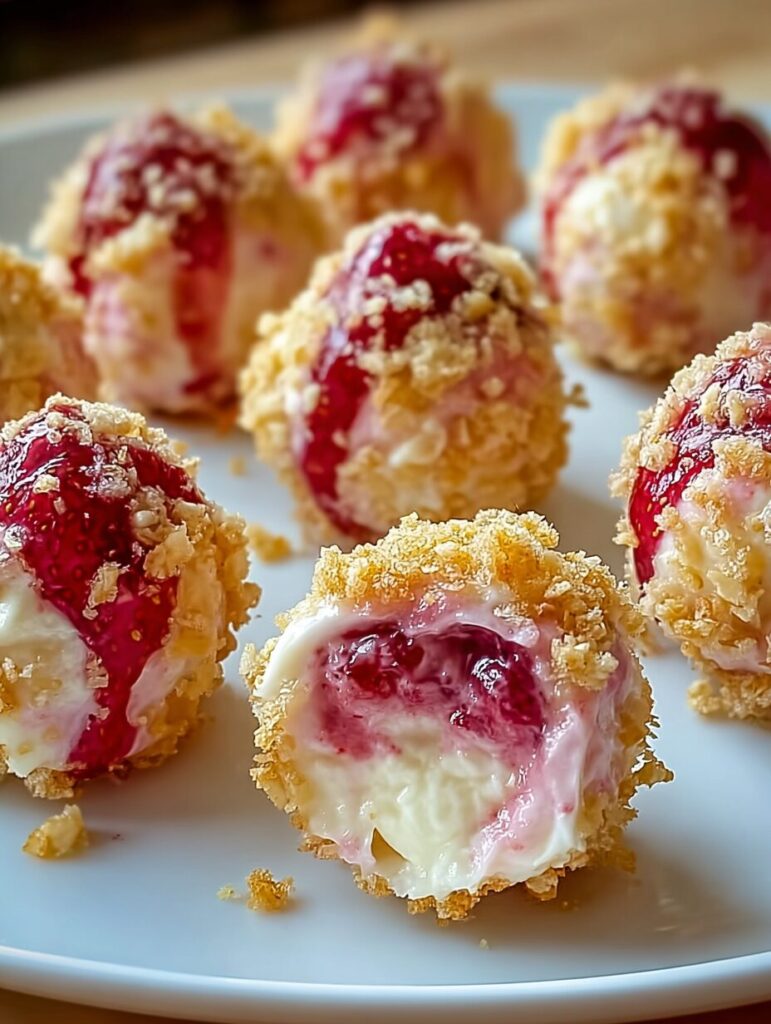 Keywords: Strawberry Cheesecake Crunch Bites, no-bake strawberry cheesecake balls
