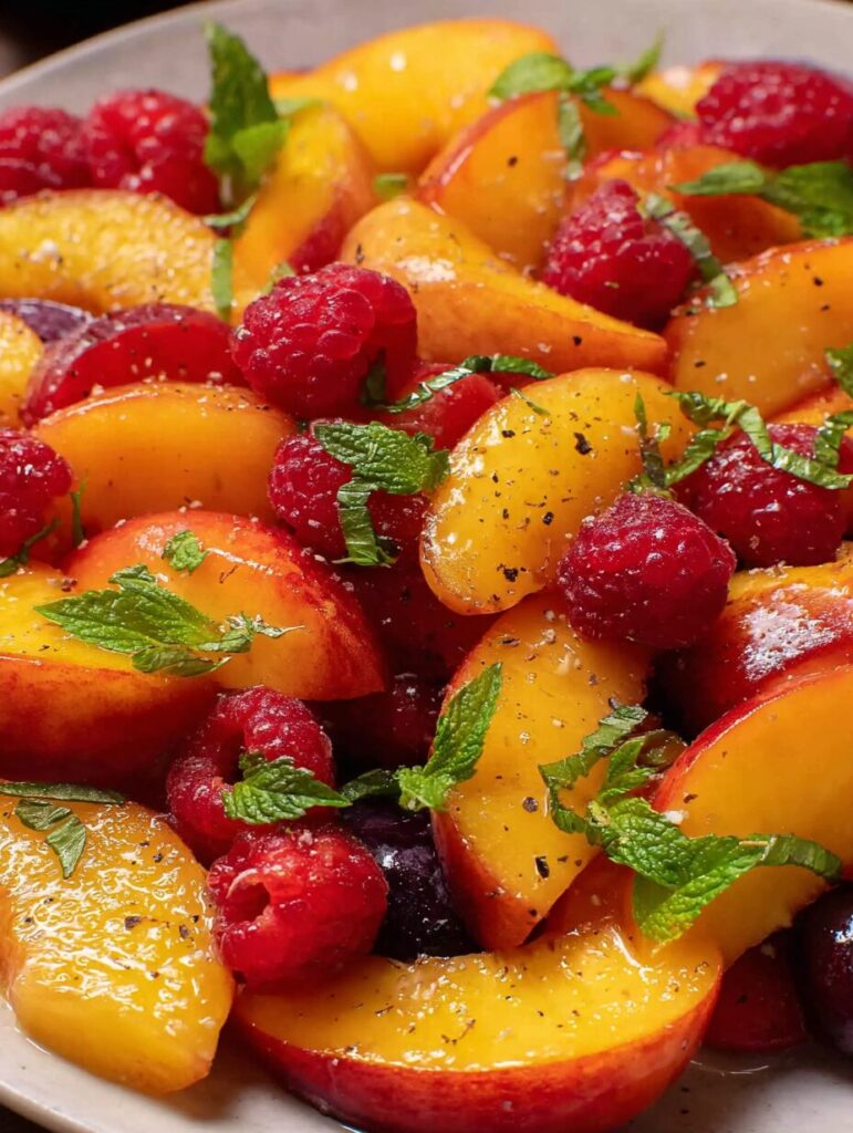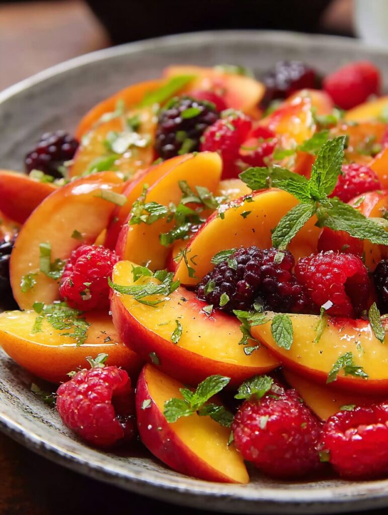A refreshing and vibrant summer peach fruit salad that combines juicy peaches with other seasonal fruits for a delightful treat.