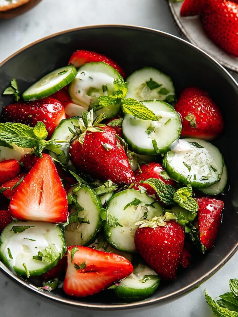A refreshing and vibrant salad combining the crispness of cucumbers with the sweetness of strawberries, perfect for summer.