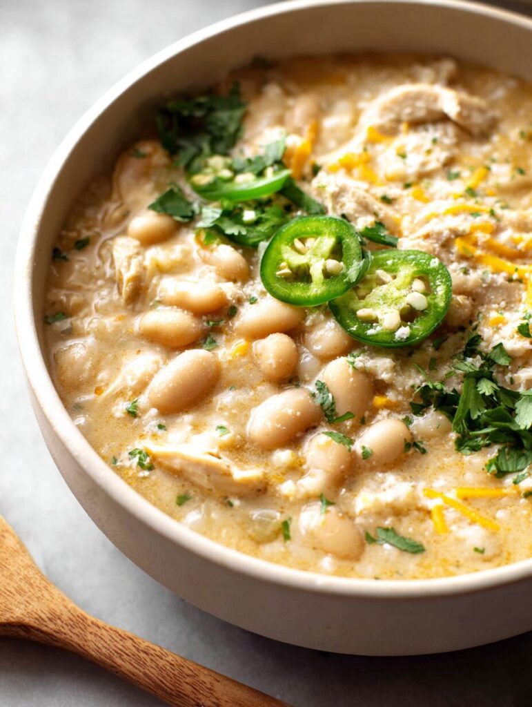 A delicious and creamy white chicken chili recipe that is perfect for a cozy meal.